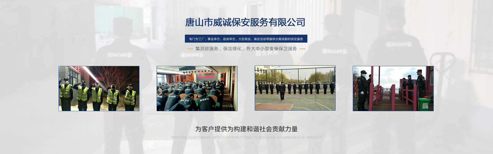 唐山市威誠(chéng)保安服務(wù)有限公司自成立以來(lái)以“嚴(yán)防死守、忠于業(yè)主”為服務(wù)原則,以“客戶(hù)滿(mǎn)意、 合作共贏(yíng)”為根本目標(biāo)。以科學(xué)的管理、多方位多層次的服務(wù),建立了首問(wèn)責(zé)任制,完善了走訪(fǎng)、回訪(fǎng) 、滿(mǎn)意度調(diào)查、末位淘汰的預(yù)警管理,不斷提高服務(wù)質(zhì)量,提高業(yè)主滿(mǎn)意度,提高企業(yè)形象。秉承“誠(chéng) 實(shí)守信,紀(jì)律嚴(yán)明,團(tuán)結(jié)協(xié)作,致精致誠(chéng)”的服務(wù)理念,為客戶(hù)提供高品質(zhì)、多方位、專(zhuān)業(yè)化的保安服務(wù)。 本公司制定了嚴(yán)謹(jǐn)?shù)亩ㄏ蛘猩?、崗前培?xùn)、考核錄用、崗中培訓(xùn)、持續(xù)培訓(xùn)、末位淘汰制等一整套完善的管理體系。可以根據(jù)客戶(hù)的要求實(shí)地勘察評(píng)估,以量身定做的方式提供安保防范服務(wù)。